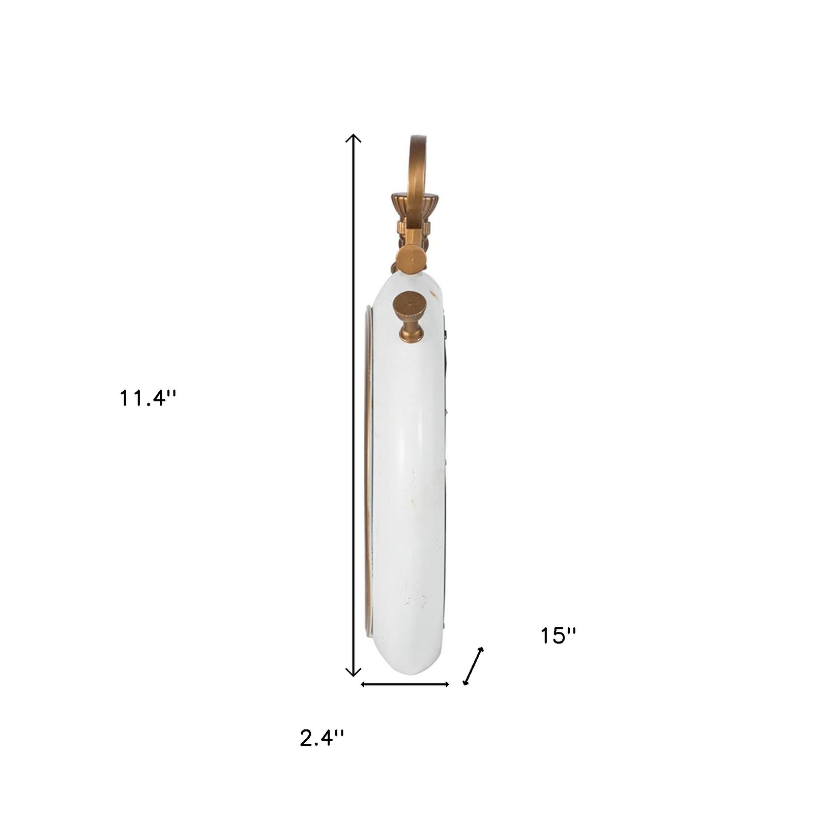 Capturing the beauty of trend and tradition, this White and Gold Pocket Styled Vintage Wall Clock exhibits a vintage style with a modern flair. The visible cluster of old iron gears from the transparent face creates a visual allure while the ivory white and soft brown plastic frame completes the look recalling the aesthetics of the Victorian era. The decorative hands and roman numerals add a classic touch to the timepiece, making it a fashionable yet practical wall accent for your home or office. 15” x 11.4” x 2.4”