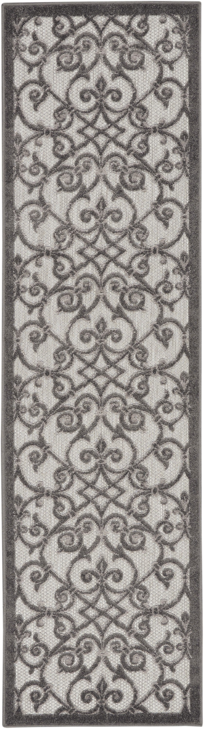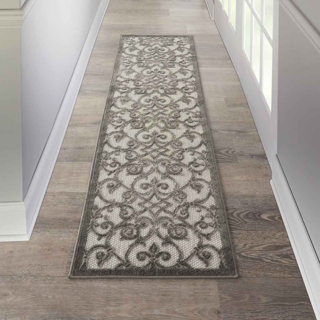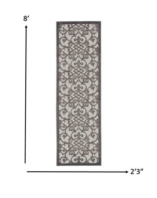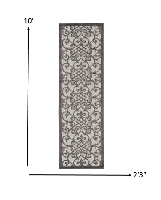This 2' x 8' gray floral indoor outdoor area rug, is a great way to add warmth to a room. This rectangle shaped rug features a floral design in gray to give it visual interest. A classic shape marries with good looking design for your space The coloring of this rug adds a delightfully neutral tone to your home and will easily match with most any decor. This superior Turkish rug represents the highest quality and is built to last. Place this area rug against a hardwood or tile floor and it will enliven your living space with style and sophistication. 1" H x 27" W x 96" D